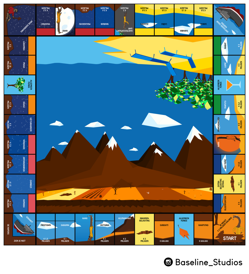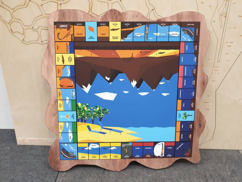 Het monopoly bord is gebaseerd op de animatie 'Motor op Zee'. Het bord bestaat uit frames van de animatie die voornamelijk in Photoshop geïllustreerd zijn.