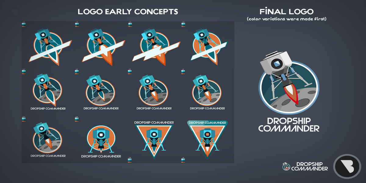 The Dropship Commander logo needed to be straightforward and distinctive. Drawing inspiration from shoulder patches typically worn on astronaut suits, I conceptualized a design. We experimented with numerous variations until we found one we favored, then fine-tuned the colors and selected the best option from a range of choices.