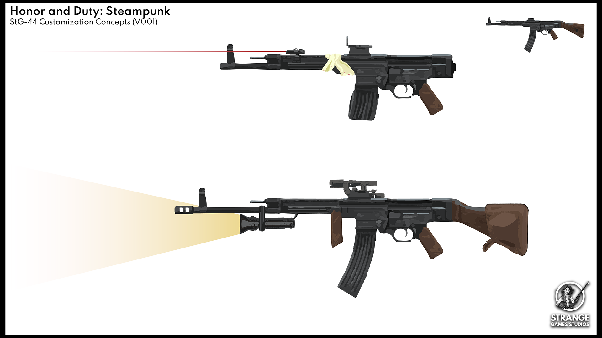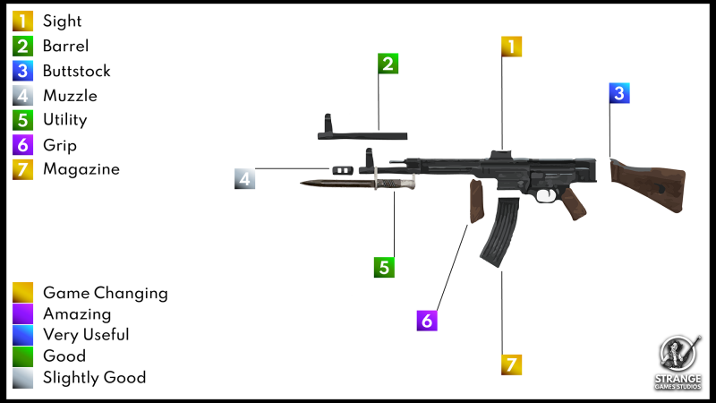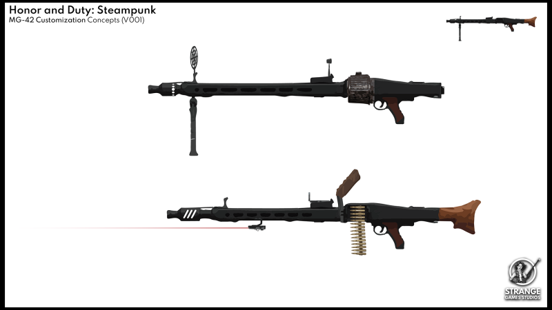 Unlocking attachments and customising your weaponry should be one of the main activities in Steampunk. It keeps players playing longer, because they want to unlock more, test new attachments and unlock new guns. With this in mind I made some early concepts for the attachment system as seen below.