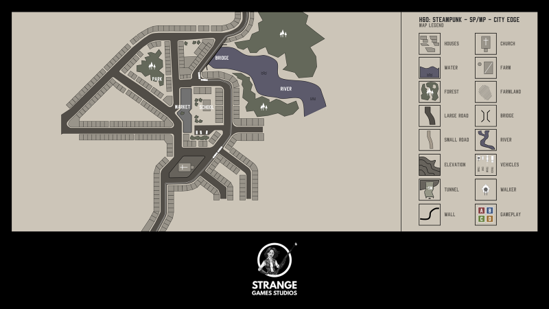 A 2D map concept is a simple overview which can easily be translated to a 3D design. Every Steampunk multiplayer and/or singleplayer map will be designed in 2D first. The image below is the concept for a city map, which will be used for multiplayer (and maybe singleplayer).